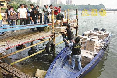 【本報訊】屯門黑幫為開拓財路,不惜斥巨資打通三聖街速遞走私通道,利用海鮮檔做掩飾,搭建私人碼頭,修建長逾10米的運輸帶,10分鐘便可裝滿一艇走私貨;配備價值35萬元高速快艇,一晚可走4轉往蛇口牟取厚利。不過,該集團前日終被海關搗破,7名男子被捕,檢獲1,200萬元走私電子貨物和快艇。