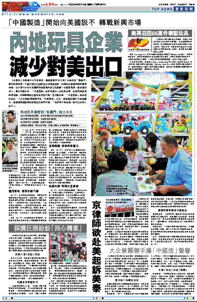 【本報珠三角新聞中心記者陳悅、唐苗苗廣州26日電】中美玩具「質量門」事件影響深遠,不僅行業出口旋即首次錄得負增長,在這段互信機制亟待重建時期,也令到不少中方供應商對美貿易失卻以往熱情。中國貿易第一展的廣交會上,事件受害主角、「中國製造」弱勢群體之一的玩具企業,紛表對美貿易前景悲觀,而這種情緒也蔓延至其他行業。但可貴的是,「中國製造」並非因此消沉,不少企業或振臂高呼為「中國製造」正名,或提價回應外方施加壓力,或積極轉戰貿易政策穩定的新興市場,「我們再不是弱者,還可以向別人說不」。