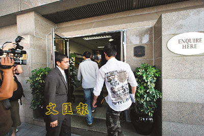 ■探員在酒店後門進入調查兩名外籍男子離奇死亡事件。本報記者蔣焯文 攝
