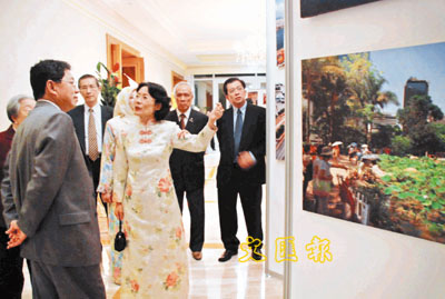 ■中國駐汶萊大使佟曉玲(前右)陪同賓客觀看與本報及《聯合日報》聯辦的「香港回歸祖國10周年圖片展」。