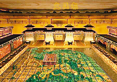 ■秦陵地宮想像圖,居中者為秦始皇棺槨。