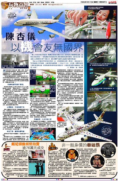 繼上月來港作飛行表演後,風靡全球的空中霸王A380,終於在前天展開商業首航,由新加坡飛往悉尼。一眾飛機迷早前為能在網上競投得慈善首航的機位,都分秒必爭。因這個A380熱潮而忙得不可開交的,還包括專門收藏和出售模型飛機的陳杏儀。
