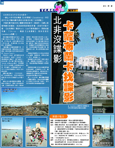 卡薩布蘭卡是非洲小國摩洛哥的其中一個城市。在網上查看有關它的資訊,找到旅客對這裡的評價,如城市半新不舊、《北非諜影》裡的Rick’s Cafe不是想像般大,更甚的留言是:「Oh no……電影《北非諜影》,原來從沒在Casablanca拍攝!」
