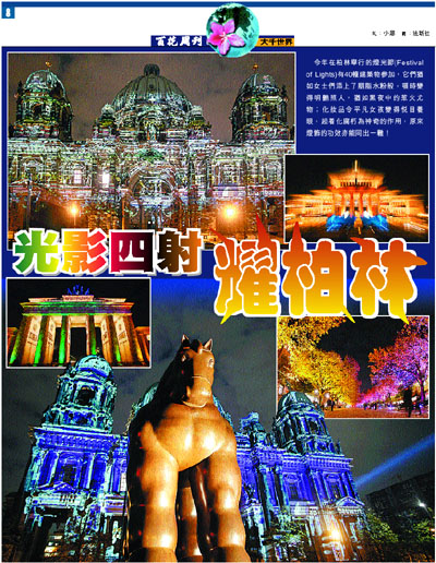今年在柏林舉行的燈光節(Festival of Lights)有40幢建築物參加,它們猶如女士們添上了胭脂水粉般,頓時變得明艷照人,猶如黑夜中的惹火尤物;化妝品令平凡女孩變得悅目養眼,起著化腐朽為神奇的作用,原來燈飾的功效亦能同出一轍!
