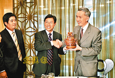■今年8月莆田市在港舉辦「經貿周」,袁錦貴書記(中)親自登門拜會香港信和置業主席黃志祥(右),推介「媽祖城」和莆田市發展商機 本報記者米南 攝