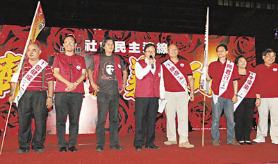 社民連昨晚在尖沙咀舉行區議會選舉誓師大會,主席黃毓民表示,社民連派出30名黨員參選,若未能取得10個議席的話,自己將會落台云云。他又要求黨員就算落選都要高票落選,因為政府會有退款,以及不要讓反對派陣營中人看輕。本報記者彭子文 攝