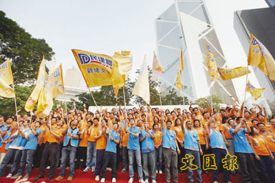 ■民建聯昨在遮打花園舉行區議會選舉造勢大會 ,力撐177位候選人。本報記者高仲明 攝