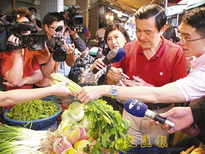 馬英九今天上午到七堵傳統市場買菜,花了350元台幣,他說,跟去年比起來,約只買到一半的菜,現在的菜價比之前漲好多倍。他可以深刻體會家庭主婦平時買菜的壓力。