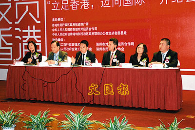 ■「投資香港深度行」——溫州站嘉賓回答與會企業家代表問題。左起:香港投資推廣署中國事務主管李淑菁、香港投資推廣署駐上海經濟貿易辦事處投資推廣總監陳景光、香港特別行政區政府駐北京辦事處總入境事務主任蘇智強、匯豐銀行(中國)有限公司分支機搆管理部副總經理曹磊、香港交易及結算所有限公司駐上海特派代表曹琴、奧康集團總裁王振滔。