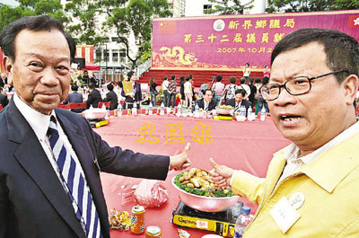 ■鄭耀棠(右)及劉皇發出席新界鄉議局安排的502席盆菜宴,慶祝第32屆議員就職禮。