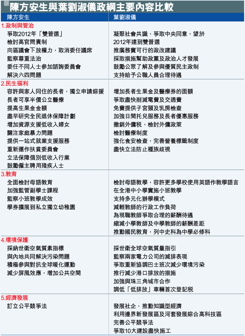 陳方安生與葉劉淑儀政綱主要內容比較 (圖)