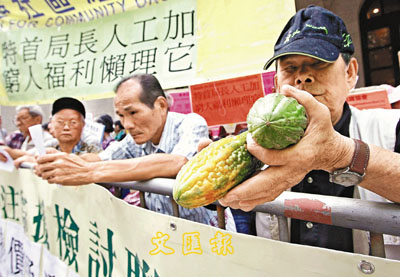 ■長者昨到立法會門外請願,要求政府訂定跟隨通脹調整的綜援金機制,確保綜援人士的基本生活需要。 本報記者彭子文 攝