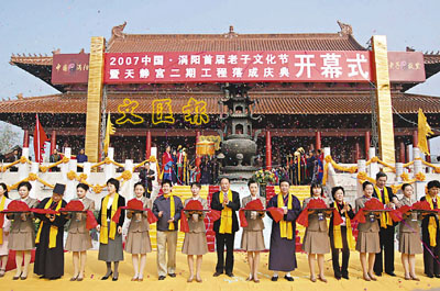 【本報駐安徽記者趙臣安徽亳州電】安徽亳州市渦陽縣老子廟—天靜宮,日前舉行二期工程落成典禮開幕式。據介紹,天靜宮是由台灣中華道教學院馬炳文教授創建,香港德士活工業公司董事長譚兆及譚兆慈善基金會發起捐資興建的道教建築群。從1991年至2006年,譚兆共發起捐資達3,000多萬元。在是次開幕式上,譚兆之子譚志豪到會致辭並參觀道觀。