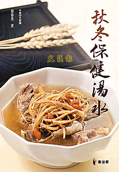 《秋冬保健湯水》的作者郭春光任中廚逾20年,製作湯水是其專長,多年來研究了各種湯水材料功效及調配味道,令湯水可滋補,亦能美味。別出心栽的,如茶樹菇紅棗烏雞、靈芝豬前蹄、蜜瓜紅棗唐排等。