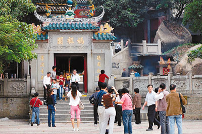 ■澳門世遺景點「媽閣廟」昨晨重開,遊客如常在廟內上香拜祭、拍照留念。