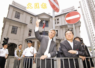 ■曾蔭權昨日到訪油尖旺區,視察該區的最新發展。圖為他參觀油麻地分區警署,了解擬建的中九龍幹線對這幢三級歷史建築的影響。