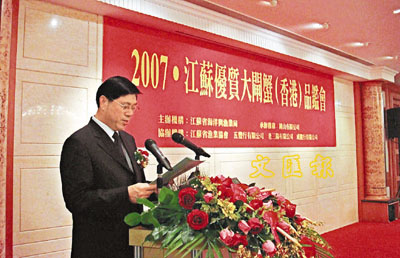 【本報訊】秋高氣爽,菊黃蟹肥,正是推銷大閘蟹的季節。江蘇省海洋漁業局、鍾山有限公司等機構日前在香港華潤大廈50樓貴賓廳舉辦江蘇大閘蟹品鑑會,與會人士可品嚐出產自太湖的優質大閘蟹,同時亦獲悉有關大閘蟹銷情的新消息。當晚出席人士包括中聯辦秘書長趙廣廷、經濟部部長王丙辛,五豐行、成隆行、老三陽等公司的負責人及城中名人。