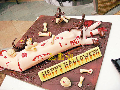 ■萬聖節是挑戰膽量的好時機,除了去鬼屋,也可試吃一些恐怖的食物。這道「恐怖之手」其實是以瑞士卷蛋加上面層的杏仁糕做成,蠍子和老鼠都只是朱古力。