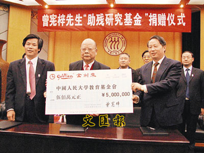 ■曾憲梓(中)捐贈人民幣500萬元設立助殘研究基金。右為人民大學黨委書記程天權。本報北京傳真