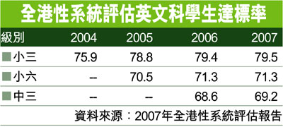【本報訊】(記者 李浩彰) 系統評估中以中三級英文達標率最低,作文科表現亦差強人意。報告顯示,不少被評為「達標」的文章,亦出現明顯的錯誤如「I would like to have a cat to do (正確為be) my pet」(我想要隻貓「做」我的寵物)、「you (正確為your) father and mother will know that」(「你」父母會知道此事),令人憂慮港生英語水平將進一步下滑。
