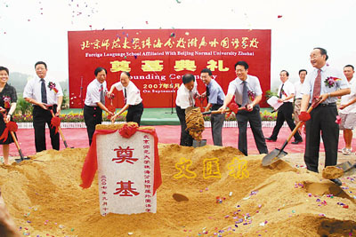 被確立為珠海「十一五」規劃項目的北師大珠海分校附屬外國語學校,日前在珠海會同村舉行奠基典禮。該校總投資1.2億元,為12年制寄宿學校,計劃可招收學生4,000人。作為外國語學校,該校除突出英語教育外,還將開設法、日、西班牙等語言課程。 ■本報珠三角新聞中心記者黃殿晶珠海電