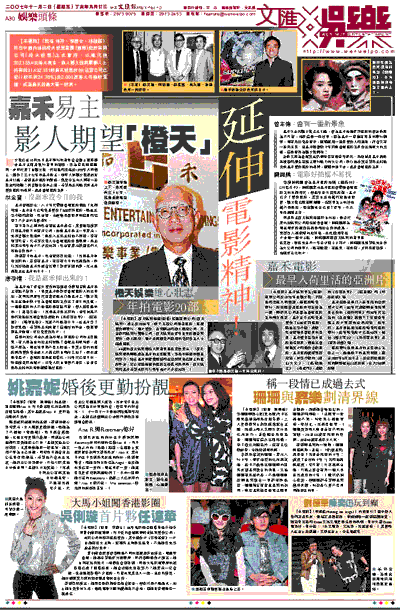 【本報訊】(記者 焯羚、李慶全、植毅儀) 昨日中國內地的橙天娛樂集團(國際)控股有限公司(橙天娛樂)正式宣佈,以總代價202,135,400港元現金,購入鄒文懷與關聯人士持有的31,432,151股嘉禾娛樂股份(佔該公司已發行股本約24.78%)及2,000萬港元可換股票據,成為嘉禾的最大單一股東。