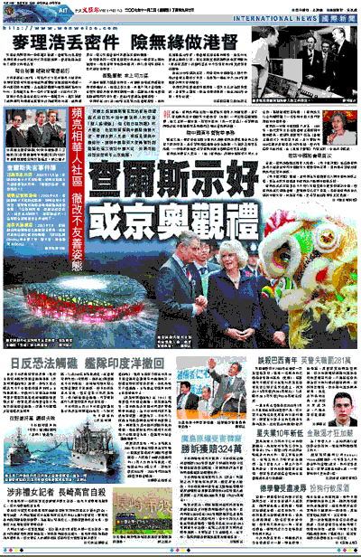 英國王儲查爾斯曾在記述香港回歸儀式的日記中將中國領導人形容為「駭人舊蠟像」,但《每日電訊報》昨天報道,他近期頻頻與中國駐倫敦大使、華僑及商人見面,明顯是想與中國修好。據稱中國駐英大使傅瑩計劃邀請他首次到訪中國大陸,如果可能的話出席明年北京奧運。