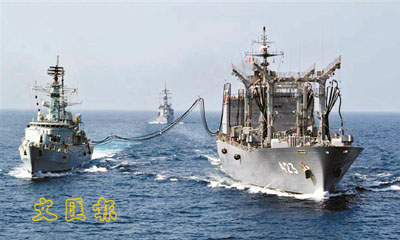 ■日本下令撤回印度洋的海上自衛隊艦隊。圖為一艘自衛隊補給船(右)為巴基斯坦驅逐艦補給燃油。 法新社