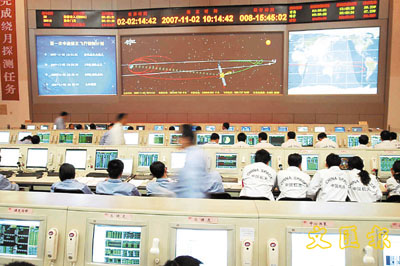 ■北京航天飛行控制中心的測控技術人員為嫦娥一號首次軌道修正忙碌工作。新華社