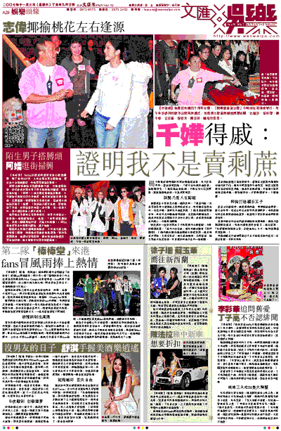 楊千嬅最近因兩個緋聞男友而備受注目,昨日於拜神時,曾志偉取笑她:「看不出你原來是食家,這麼懂得吃。」揶揄她左右逢源,千嬅立即以狂笑解窘,更迅速遠離志偉,以免再被嘲笑。