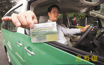 ■的士、小巴權益關注大聯盟主席黎銘洪,向傳媒展示落馬洲口岸的輪候籌。本報記者彭子文 攝