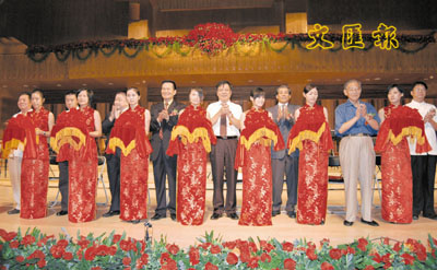 ■廈門市政協主席陳修茂(後排左五)、副市長郭振佳(後排左二)、以及曾琦(後排左四)等出席音樂廳落成典禮。本報福建傳真