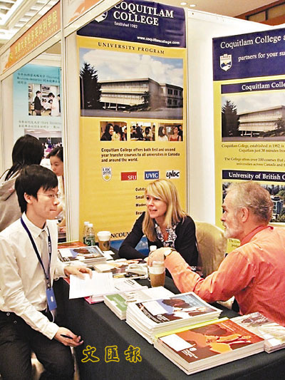 11月1日在穗舉辦的「2007國際名校招生展」上,加拿大高貴林學院的展位前擠滿了前來諮詢的學生和家長。該展位負責人稱,學院首創與北美大學「直接轉移學分」的課程,申請人只需高中平均分達70分,無須高考成績或IELTS分數便可申請該校。學生在高貴林學院修畢2年大學課程後,便可申請至與該校有合作關係的北美知名大學就讀。若按照以往的留學申請路徑,學生高中畢業後想入讀名牌大學,需要高中平均分至少有85至89分,申請人的高考成績佔學校考核標準的75%以上,同時要附帶IELTS的分數要求。