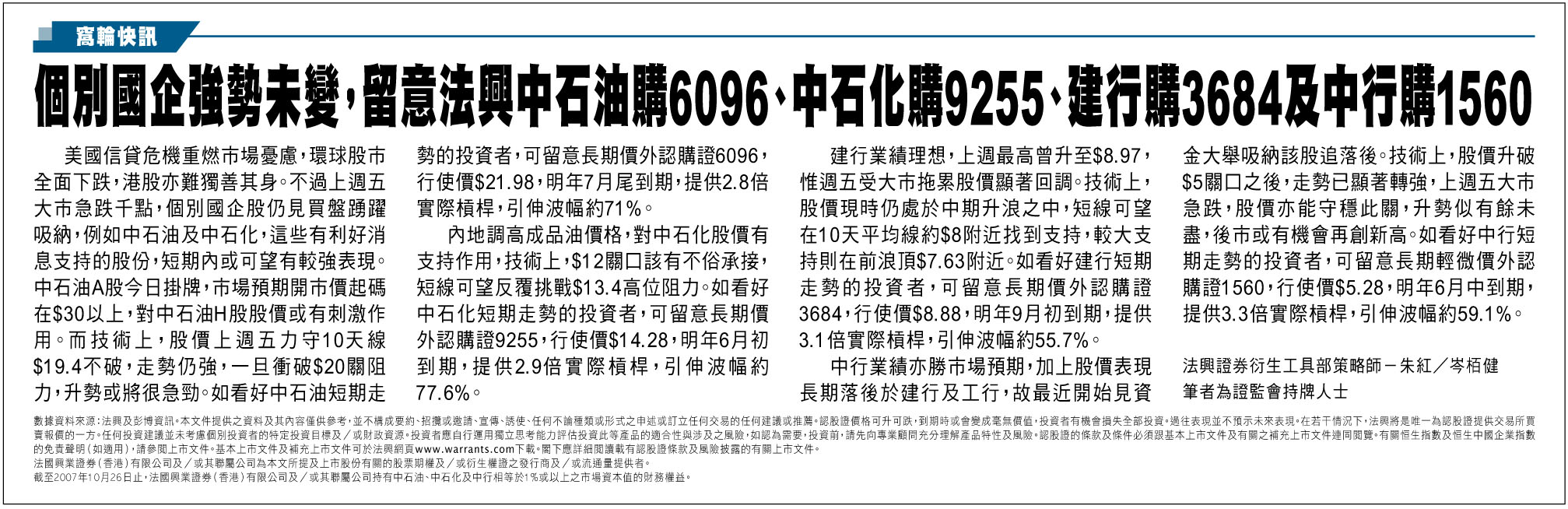 窩輪快訊:個別國企強勢未變,留意法興中石油購6096、中石化購9255、建行購3684及中行購1560