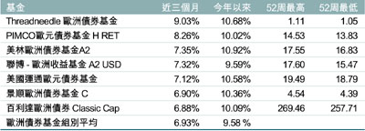 佔近三個月榜首的Threadneedle 歐洲債券基金,基金主要通過投資於政府和跨國組織(投資地區可包括東歐市場)發行的債券,以達收入及資本增長的目標。
