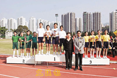 東華三院屬下小學日前在沙田運動場舉行聯校運動會,東華三院主席王家龍偕主禮嘉賓教育局首席助理秘書長葉靈璧與獲獎學生合照。