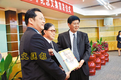 ■番禺區區委書記譚應華(右一)、區長駱蔚峰(左一)向霍震霆贈送《霍英東風範長存》。