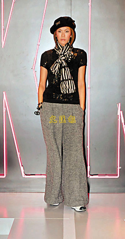 ■闊腳長褲,配襯黑色上襯衣及打上蝴蝶結的絲質頸巾,頭上戴著畫家帽,充滿個人風格。黑色上襯衣:$2,390;灰色闊腳長褲:$2,790;條子長絲巾:$1,190;黑色畫家帽:$590