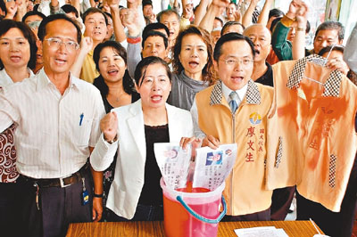 台北市議員簡余晏與台北縣議員陳啟能、吳琪銘,8日在10多位台聯黨員的陪同下宣佈退黨。另外,台聯籍立委尹伶瑛繼日前黨中央公開請其自行退黨、撤銷提名後,尹伶瑛今天率同台聯黨雲林縣黨部主委廖文生共101位黨員,正式宣佈退出台聯黨,更將黨證丟入紅墨水桶,象徵紅衫軍赤化台聯黨。