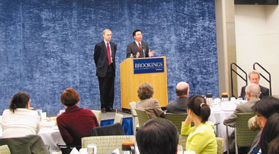 【本報訊】據中通社8日電:台灣駐美代表吳釗燮美東時間7日在華盛頓智庫「布魯金斯研究院」演說,談論台灣的民主發展時,遭到在場人士的連番質問,有人質疑民進黨當局把手伸進媒體,有人詰問台灣推「入聯公投」是不是要把美國人拖進戰火。
