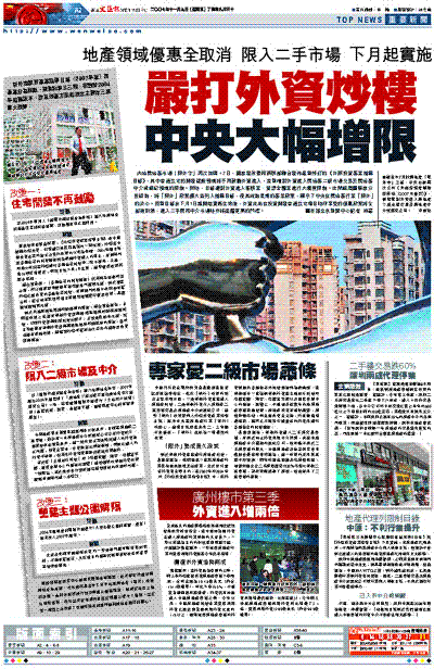 內地房地產市場「限外令」再次加碼。7日,國家發改委和商務部聯合發佈最新修訂的《外商投資產業指導目錄》,其中普通住宅的開發建設領域將不再鼓勵外資進入,並新增對外資進入房地產二級市場交易及房地產中介或經紀領域的限制。同時,目錄還對外資進入服務業、資源金屬業進行大幅度限制。此間經濟觀察家分析認為,將「限外」政策擴大並列入指導目錄,使其成為長期的產業政策,顯示了中央在房地產行業「限外」的決心。而新目錄自下月1日起開始實施生效後,外資此前在投資開發普通住宅項目時所享受的優惠政策將全部被取消,進入二手房和中介市場時亦將面臨更高的門檻。