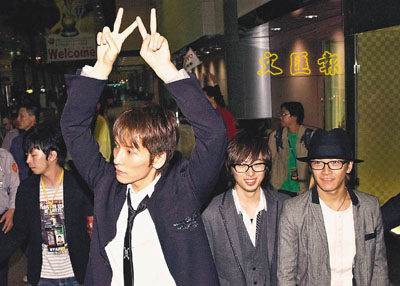日本當紅組合w-inds現身台灣,引來400fans熱情接機,場面瘋狂。雖是第四度訪台,仍無損fans熱情,有fans更自製求婚海報要主音慶太把她們娶回家,甚至還大喊:「慶太!快來強暴我!」w-inds在記者會上亮相表現興奮,頻頻以象徵團名的w手勢和歌迷打招呼,多次訪台,團員對台灣美食也不陌生,慶太表示,想品嘗美味的小籠包,而龍一跟涼平則對珍珠奶茶情有獨鍾,剛下飛機就吵著要工作人員去買,龍一還稱讚「珍珠奶茶能讓世界保持和平」,他們已投入綵排工作,為今日的演唱會作準備。■文:Ivy/圖:中央社