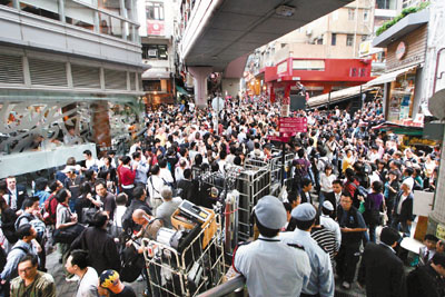 ■攝製隊在擺花街取景,數百名市民在天橋及路旁圍觀。本報記者潘政祁 攝