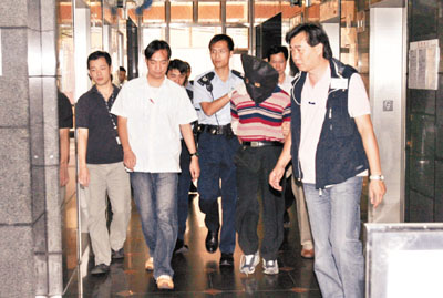 ■技工砍死妻女3人罪成,判囚終身。圖為被告當日被警方押走調查。 資料圖片