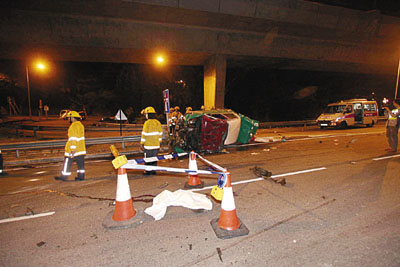 【本報訊】今晨消息:粉嶺公路今晨零時49分發生奪命車禍,當中涉及3輛車,包括拖車拖頭、的士及巴士,其中的士司機拋出車外當場身首異處慘死,另3人受傷,傷者送往北區醫院救治。