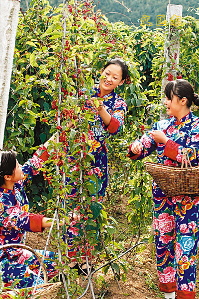 ■五味子豐收,丹東市大梨樹村村民在採摘五味子。