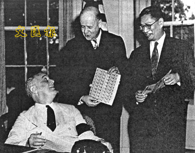 ■美國郵政總局局長(中)向羅斯福和宋子文(右)贈送「中國抗戰」郵票。