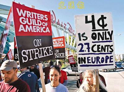 因DVD及網絡下載等利益分帳無法達成共識,美國作家協會和影視監製聯盟的關係破裂問題已進入第8日,不少人都維持每天在荷里活片廠門前示威的動作。只是監製聯盟方面現已作出還擊,前日於兩份業內刊物《Varitey》與《The Hollywood Reporter》刊登全版廣告重申立場,宣稱編劇們早已獲得影視作品被下載時的收益。