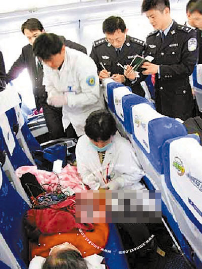 女孩的神志一直很清醒,但臉色慘白,身體非常虛弱。由於在飛機上沒有尋找到醫生,不能確診女孩的病情,乘務員不能冒失地給她進行治療。十點半左右,女孩突然又爆發嘔吐,這次比上次更為嚴重,吐到後來直接就是吐鮮血,還伴隨著大小便失禁,而且連排洩物中都摻雜了鮮血。