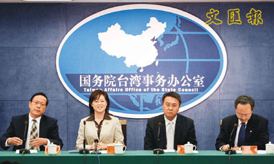 ■國務院台灣事務辦公室14日舉行例行新聞發佈會,女發言人范麗青(左二)首次登台亮相。她嚴正指出,對於加蓋「入聯」郵戳的台灣郵件,大陸一律予以退回。 中新社